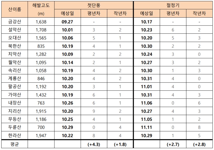 - 웨더아이는 올해 첫 단풍은 평년보다 느릴 것으로 전망했다. 10월 1일 설악산을 시작으로, 중부지방에는 10월 19 ~ 20일, 지리산과 남부지바에서는 10월 20 ~ 26일 사이에 첫 단풍을 볼 수 있을 것.