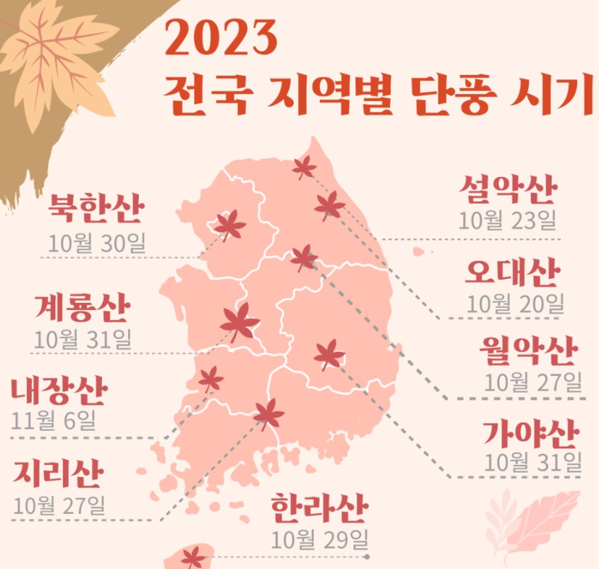 알록달록한 가을 속으로! 2023 단풍놀이 떠날 지도 올가을 단풍 여행도 대한민국 구석구석과 함께하세요! 북한산, 설악산, 오대산, 치악산, 월악산, 속리산, 계룡산, 내장산, 무등산, 두륜산, 팔공