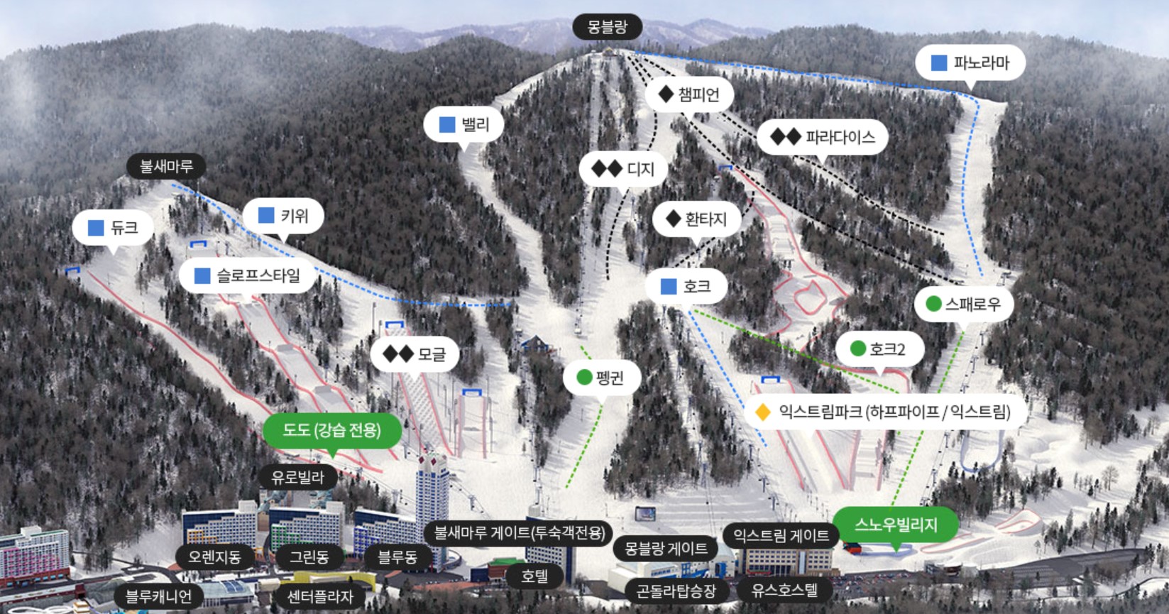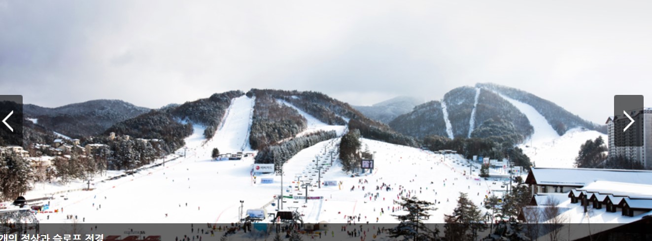 - 용평리조트가 모나 용평으로 이름이 변경되었다. 가장 높은 슬로프에 오르면 발왕산이 한눈에 보이는 절경, 5.6km에 달하는 긴 슬로프를 자랑한다. 케이블카를 타고 발왕산 꼭대기에서 시작하는 슬로프. 눈이 오면 더 아름다운 광경을 맛보게 될 것이다. 초보자는 옐로나 핑크라인이 괜찮음. 다키닥팜이라는 식당에서 고기를 즐겨 든든함을 채우자.