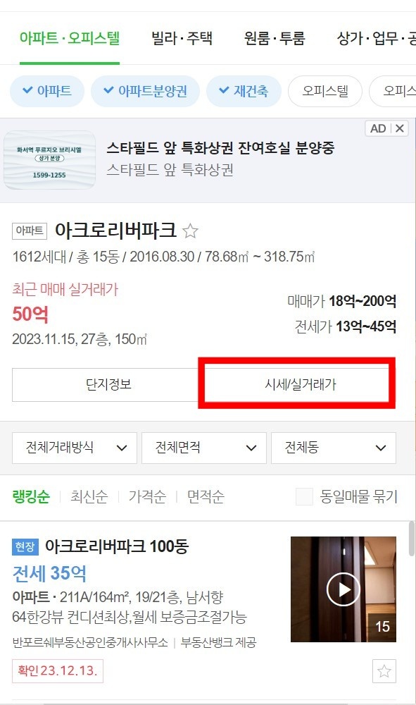 - 웹사이트나 네이버 부동산 메뉴로 들어가서 시세를 알고자 하는 건물이름을 돋보기 모양에 입력