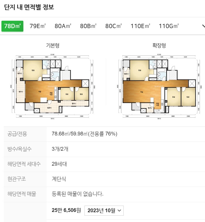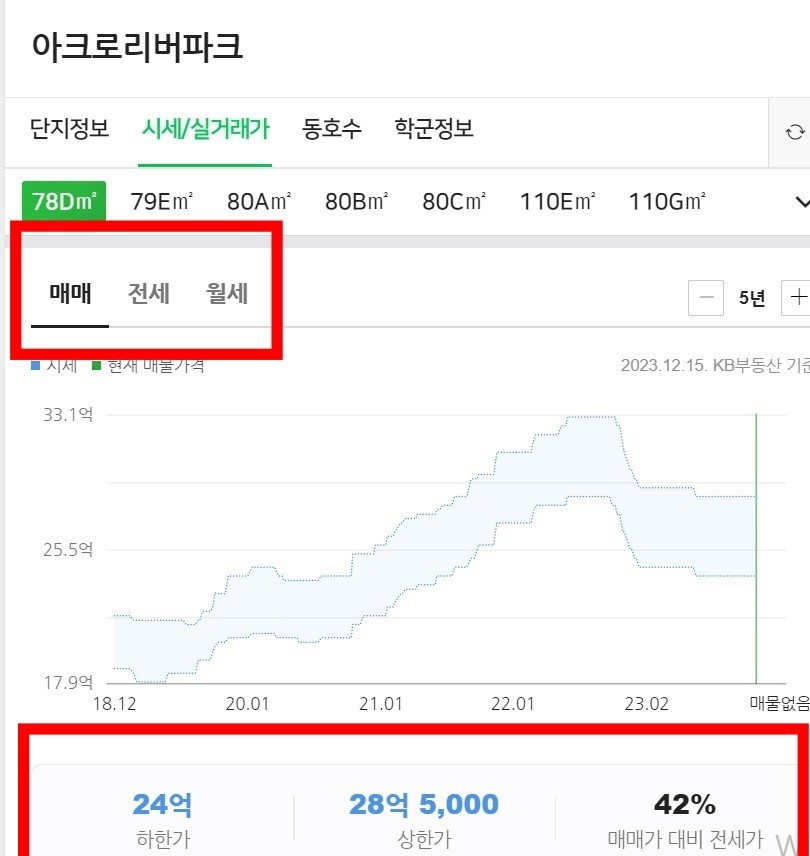 - 시세/실거래가 누르면 아래와 같이 매매/전세/월세가 나오는 데 여기서 원하는 것을 선택하고 평 단위보고자 하는 경우