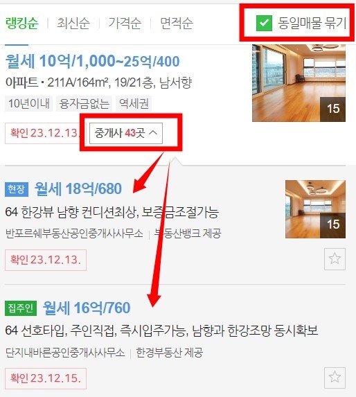 - 오른쪽 그림이 동일매물 묶기 체크로 표기된 매물들