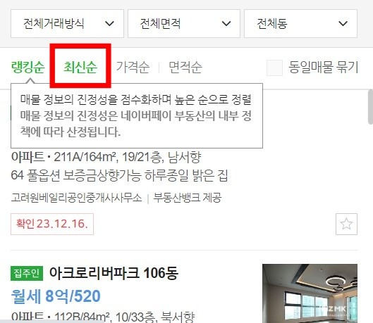 - 왼쪽 그림이 최신순 목록을 클릭하여 최신순으로 표기된 매물들