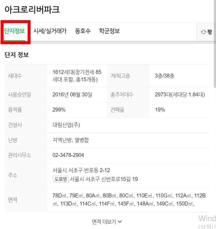 - 단지정보 탭 누르면 이 아파트의 단지 정보를 한눈에 볼 수 있음.