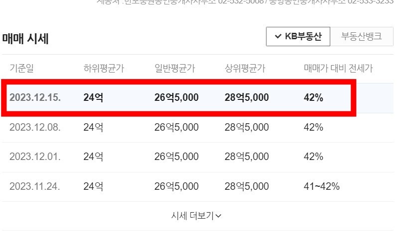 - 아래엔 하한가/ 상한가 및 매매가 대비 전세가도 확인 가능