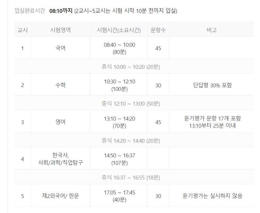 - 4교시 한국사 영역 시험 이후, 탐구 영역 시험이 진행됨. 한국사 영역 시험시간은 30분이며, 한국사 영역 종료 후 15분의 문답지 회수 및 탐구 영역 미선택자 대기실 이동 시간을 둠.
