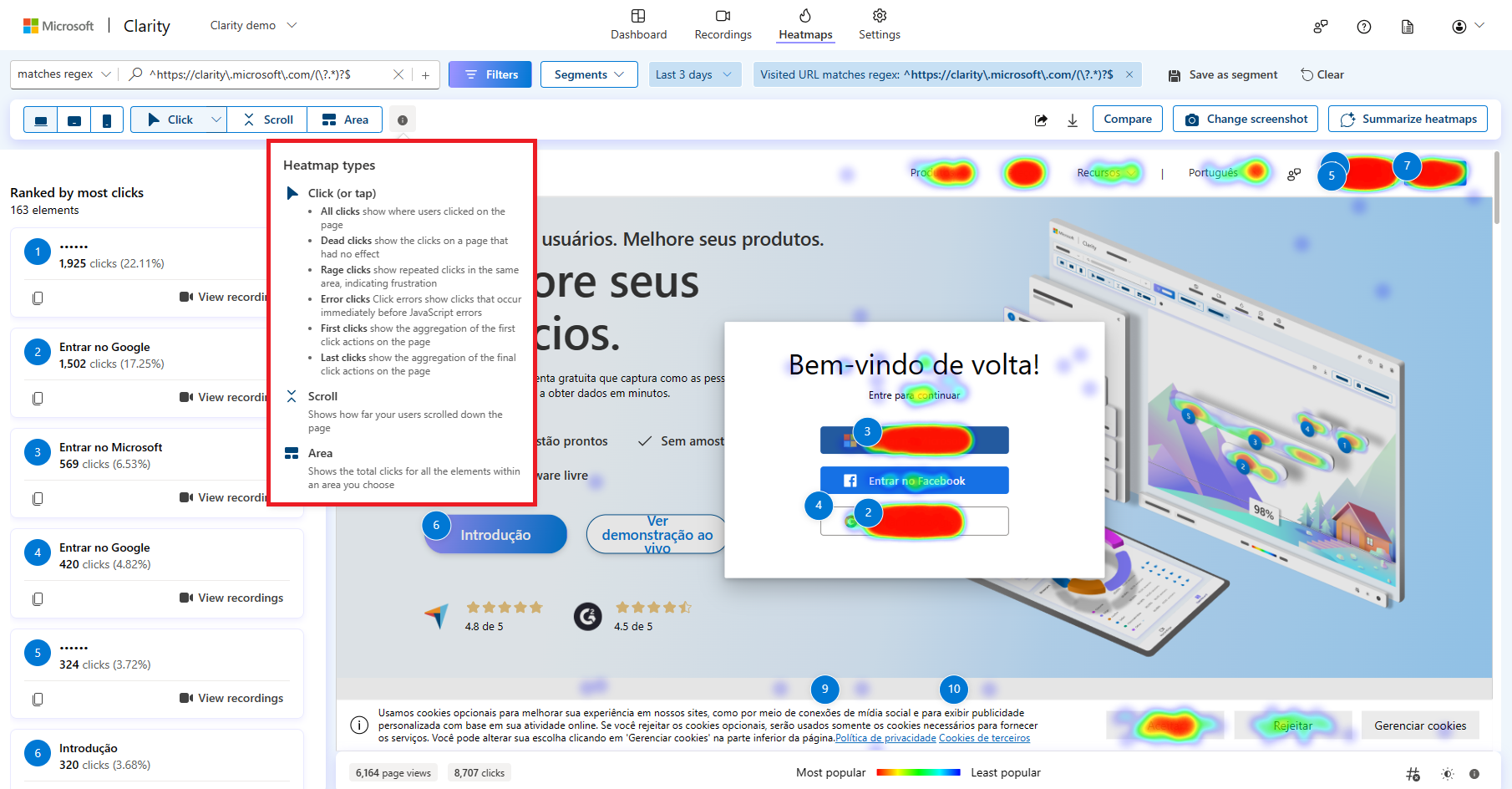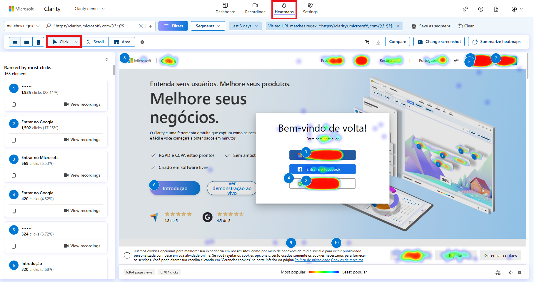 - 명확성 영역 지도에는 선택한 부분에 총 클릭수가 표시됩니다.