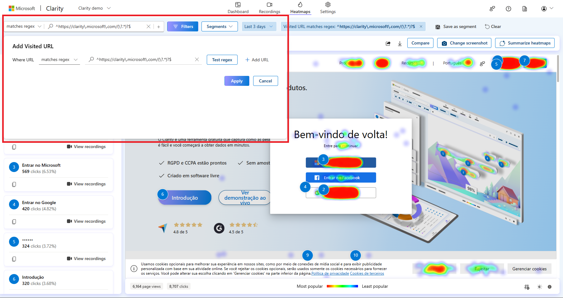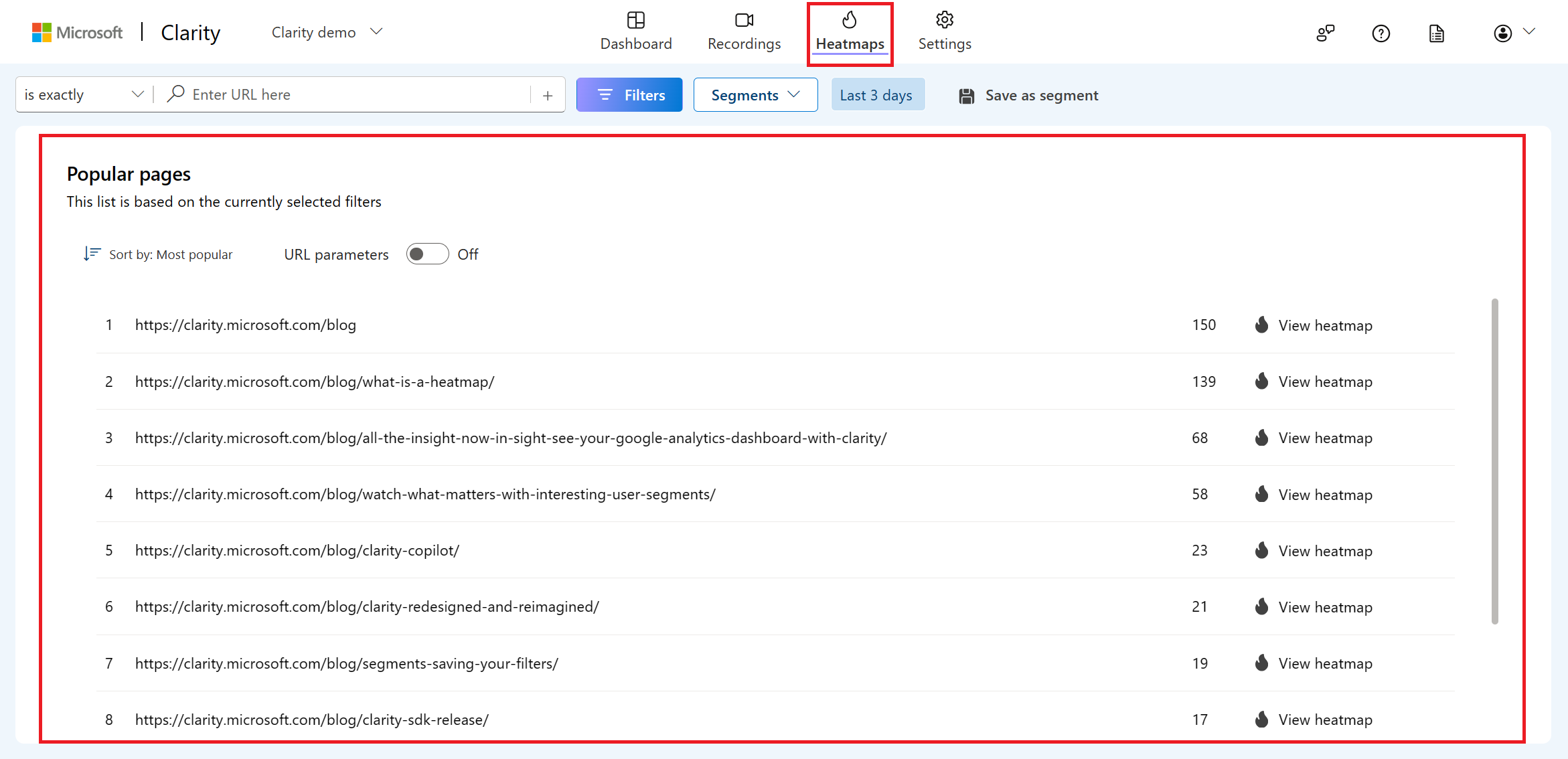 - URL 매개변수를 활성화하고 URL을 선택하여 정확하게 일치하는 히트맵을 볼 수 있다.
