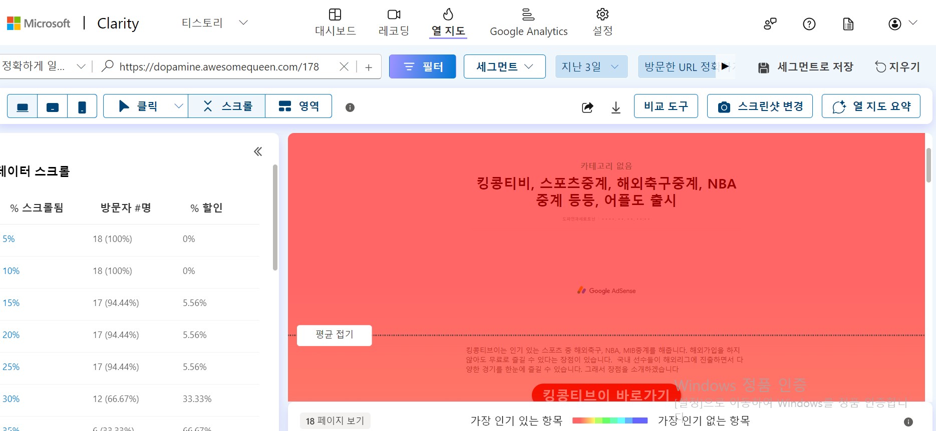 - 아래 빨간색 ~ 파란색으로 가면 사용자가 덜 클릭한 부분입니다.(빨간색이 제일 많이 클릭)