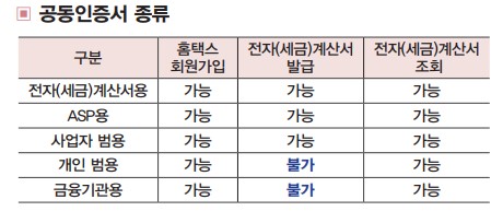 → 공동인증서 : 사업자범용, 전자(세금) 계산서용, ASP용 발급