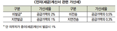 - 의무발급 대상자가 전자세금계산서를 발급 또는 전송하지 않을 경우 가산세가 부과.