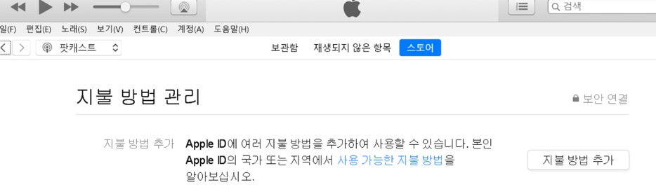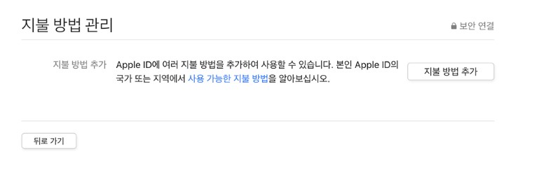 2. Apple ID로 로그인 후 지불 정보 옆에 있는 지불방법 관리 버튼을 클릭한다. 사용 중이면 수정버튼클릭한다.