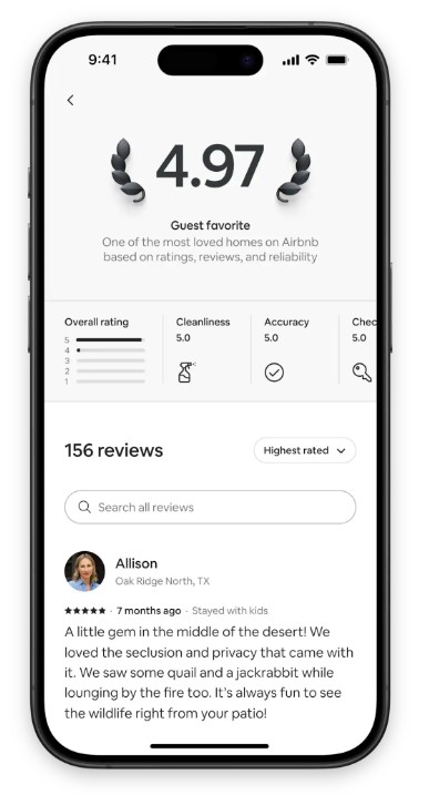 - 50억 건이 넘는 에어비앤비 게스트들의 숙박 평점, 후기, 신뢰도 등에 따라 호평을 받고 있는 200만 개의 숙소 선별.