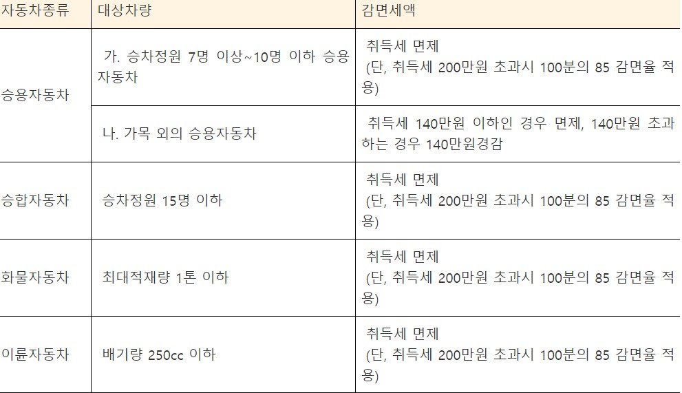 - 배기량이 1,000cc 미만이며, 길이가 3.6m, 너비가 1.6m, 높이가 2m 이하인 비영업용 승용자동차를 취득 시 감면해 준다.