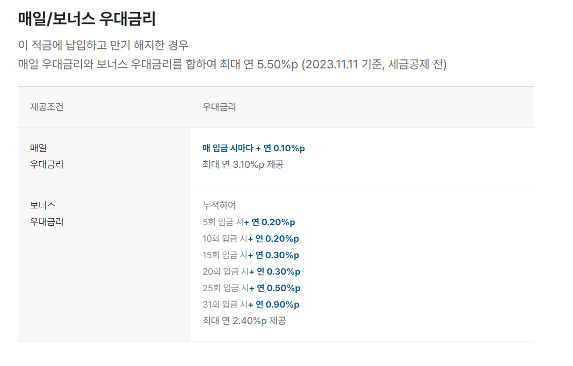 - 매일 우대금리 👉 연 0.10%씩 매일 제공, 보너스 우대금리 👉 최대 6회 특별한 날 제공