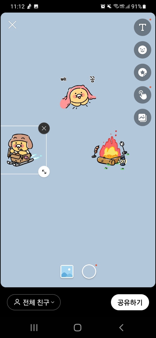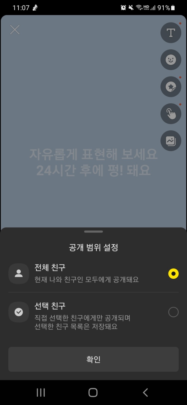 STEP3 👇오른쪽 상단 버튼에 원하는 텍스트, 이모티콘 등등 나의 일상을 표현, 공유하고픈 친구 선택👇