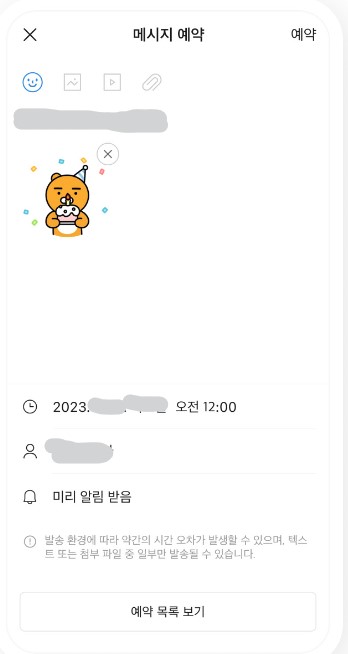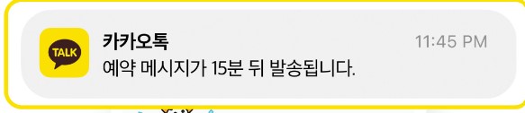 ※ 예약 메시지 표시 없이 일반 메시지처럼 발송되며, 나와의 채팅방에서 카톡 프로필로 메시지 보냄