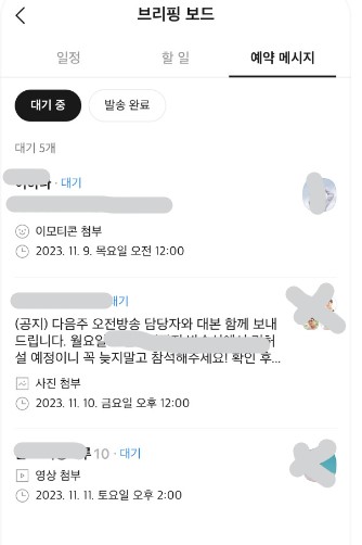 STEP4 👇예약 메시지 목록은 브리핑 보드에서 모아볼 수 있음(나와의 채팅방에서 사이드 메뉴 또는 '예약 목록보기')👇