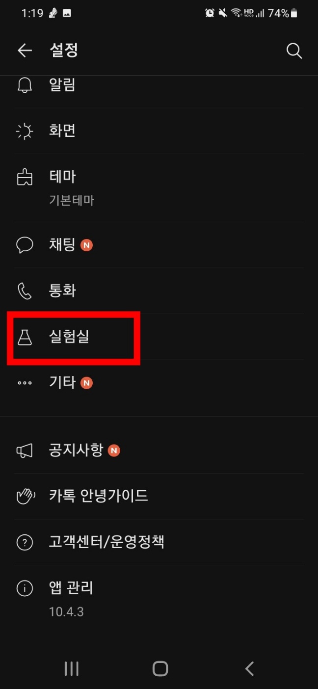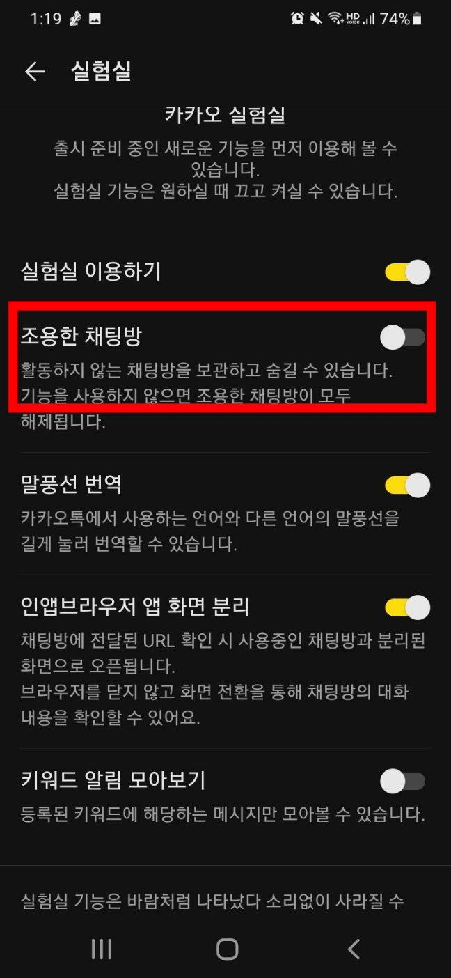 STEP2 👇실험실 클릭하여 실험실에서 이용하기 활성화하고 조용한 채팅방 활성화하기👇