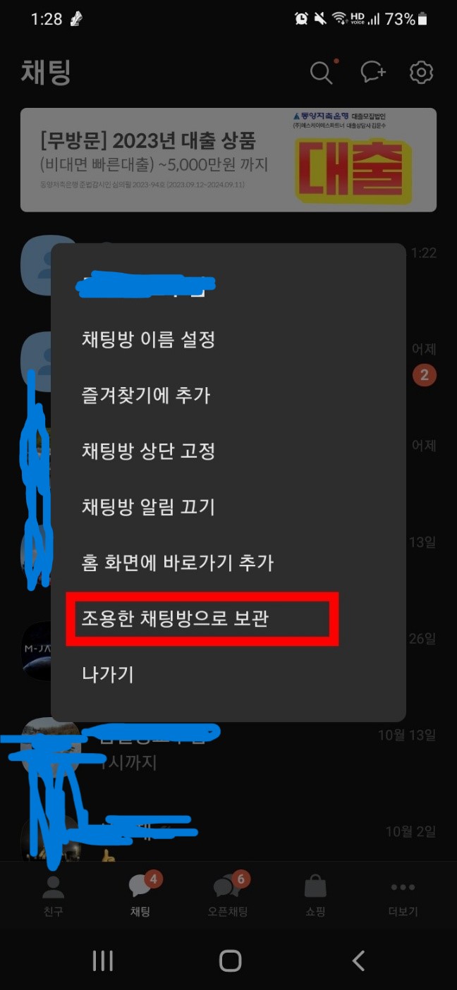 STEP4 👇원하는 채팅방을 길게 누르면 조용한 채팅방으로 보관이라는 팝업창이 뜬다.👇