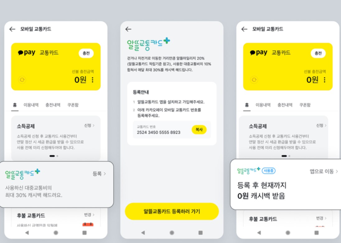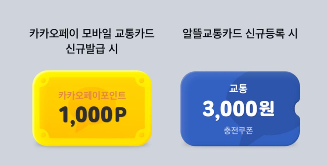- 알뜰교통카드 앱에 처음 등록한 고객은 첫 결제 시 3,000원 교통충전쿠폰제공.