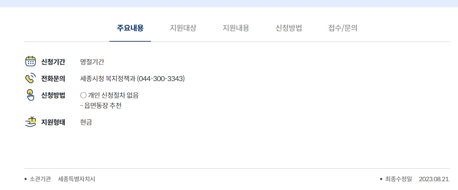 지급금액 : 설, 추석 명절에 가구당 5만 원 지급(연 2회 지원)