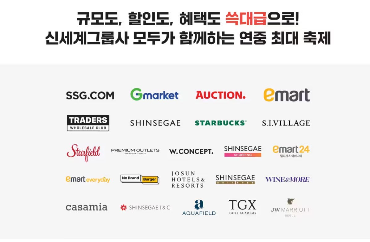 2023 대한민국 쓱데이 역대급 그 이상으로 할인을 진행합니다. 규모도, 할인도, 혜택도 쓱대급으로! 신세계그룹사 모두가 함께하는 연중 최대 축제를 합니다. 그룹사별로 다양한 혜택이 있습니다. 쓱 소개하겠습니다.