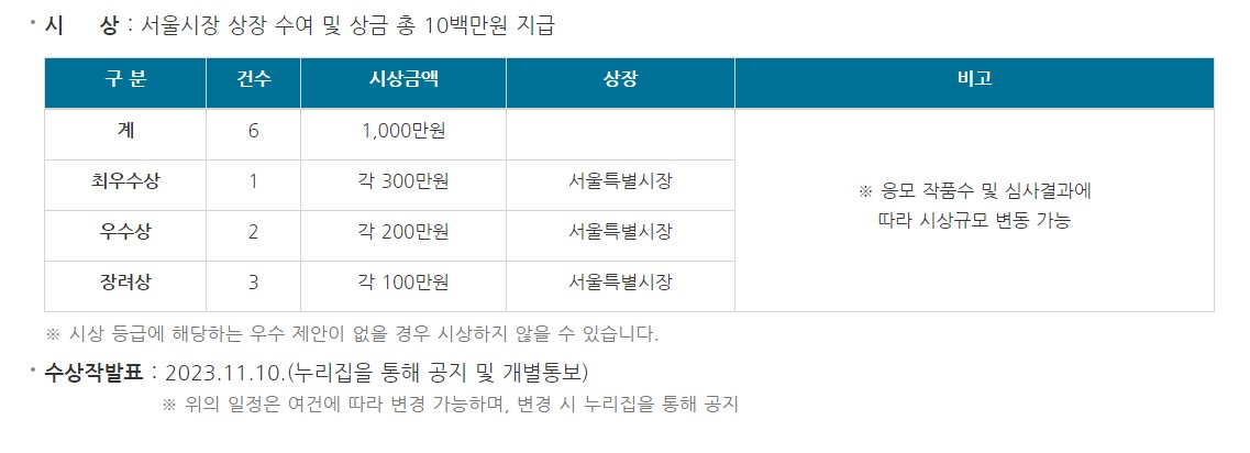 - 접수방법 : '내 손안에 서울' 홈페이지 공모전 메뉴 또는 하단의 신청버튼으로 접수