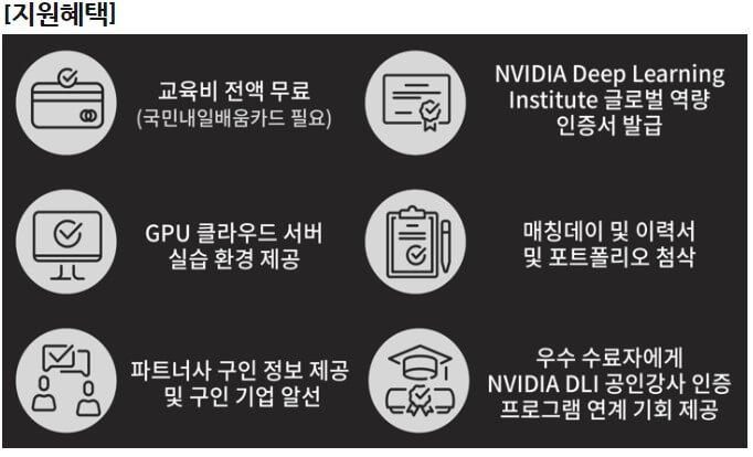 인공지능 컴퓨팅 기술 분야에서 매우 뛰어난 실적과 인지도로 선두하고 있는 엔비디아가 AI 연구개발 인력 양성을 위해 한국 표준협회와 한컴아카데미와 합세해서 엔비디아 AI 아카데미를 개설합니다. 고용노동부와 직업능력심사평가원과 함께하는 부분으로 AI분야로 취업을 희망하는 지원자 중 국민내일 배움 카드의 발급이 가능하면 누구나 참여할 수 있습니다. 또한 수강료는 전액 국비 지원으로 무료로 수강이 가능합니다. 많은 참여 바랍니다~~