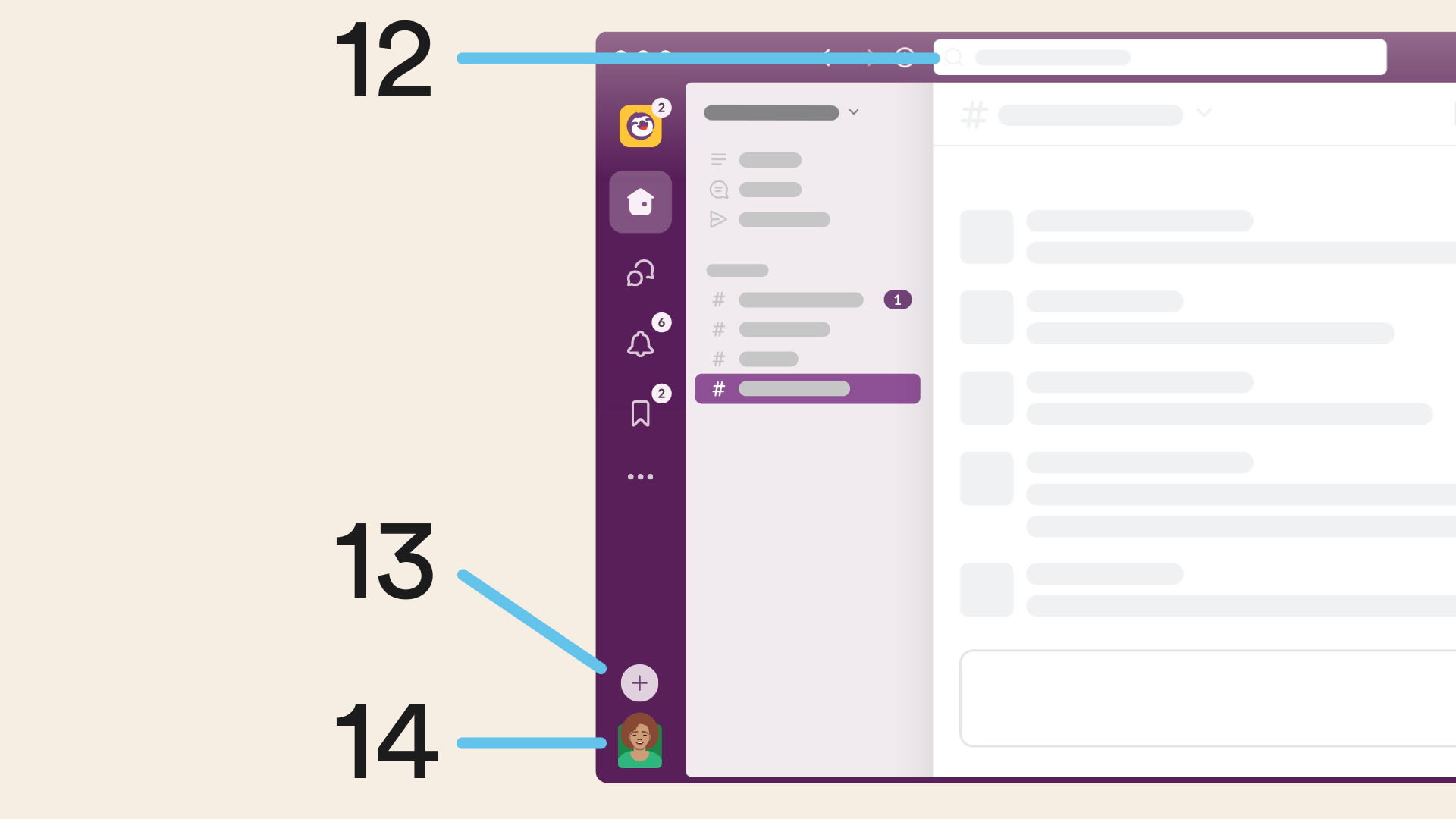 - 12번 항목은 검색창으로 클릭하면 팀의 대화 내역을 검색하여 업무를 수행하는 데 필요한 관련 메시지, 파일, 채널, 사람을 찾을 수 있습니다.